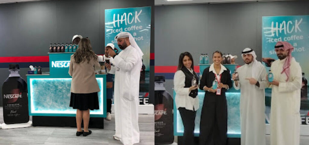 A branded Nescafé setup was installed within the Gulf Bank premises, featuring prominent product visuals and a serving counter. Trained promoters prepared iced coffee live using Nescafé Espresso Concentrate, allowing employees to witness the simplicity of the preparation process. Freshly made samples were then served directly to employees, accompanied by brief product explanations highlighting taste, convenience, and ease of use.